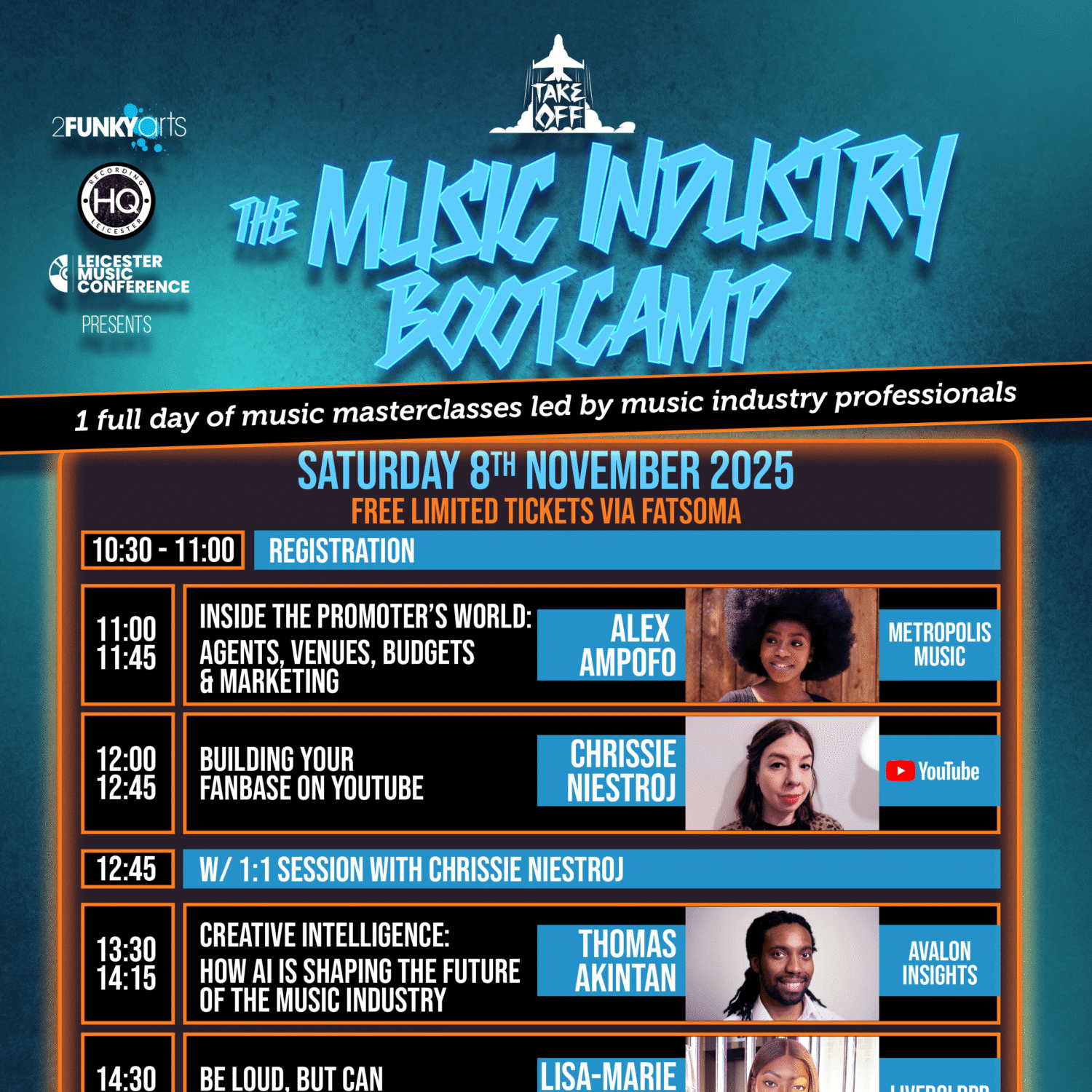 1 full day of music masterclasses The Music Industry Bootcamp Sessions The Music Industry Bootcamp returns on Saturday 8th November 2025. Expect 1 full day of music masterclasses led by Industry Professionals. Location: HQ Recording, 38 Charles St, Leicester, LE1 1FBLimited FREE Tickets TIMETABLE 10:30am – 11:00am – Registration 11:00am – 11:45am – Session 1Inside […]